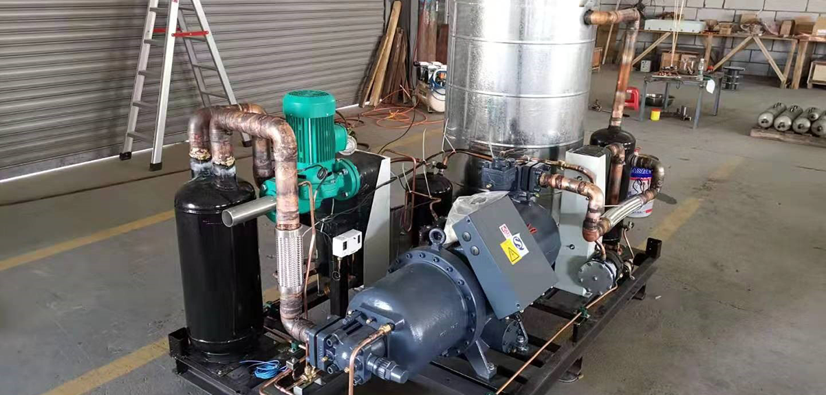 某地能源所實驗製作一個高溫熱水機的樣機,可以用來直接出熱水和蒸汽。機組選用漢鐘精機RC2-T系列餘熱接纳超高溫熱泵壓縮機,採用R245fa冷媒,蒸發器水溫50℃以上,冷凝器水溫120℃,制熱量100KW。